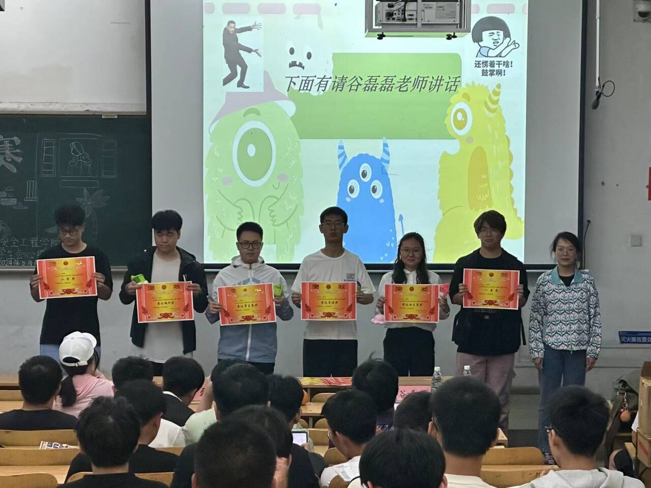 欣赏完各个剧组的倾情演出,谷磊磊老师发表讲话,对本次大赛做出了肯定,同时对演员表示鼓励,传达了心理健康的重要性。大赛最后通过评委评分,23140344获得一等奖,23140141、23140342获得二等奖,23140342、23140243、23170142获得三等奖。