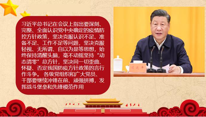 会上,通过对中共中央政治局常务委员会会议精神的学习,党员同志们领悟到要深刻、完整、全面的认识党中央确定的疫情防控方针政策,坚决克服认识不足、准备不足、工作不足等问题,在疫情保卫战中继续冲锋在前、顽强拼搏,发挥战斗堡垒和先锋模范作用。随后,组织大家观看了习近平总书记在庆祝中国共产主义青年团成立100周年大会的讲话,党员同志们意识到只有认真接受政治训练、加强政治锻造、追求政治进步,积极学习党政知识才能不负党和人民最殷切的希望。