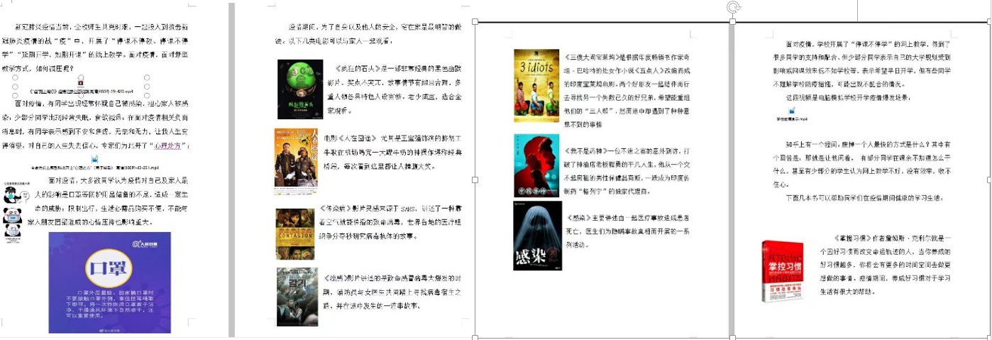根据《疫情防控期间本科生思想状况调查报告》中疫情期间学生在心理等方面出现的问题,整理出“疫情防控小贴士”,指导学生以积极的心态对待疫情及疫情期间出现的心理、生活等方面的问题。正确对待“停课不停学”“延期开学,如期开课”的线上教学,用书籍充实自己。
