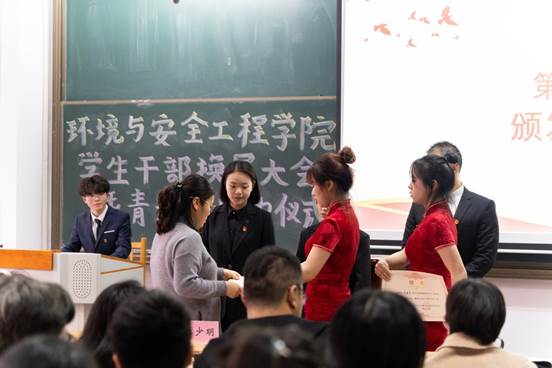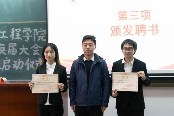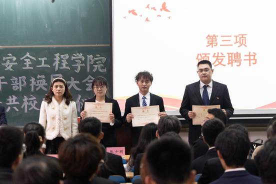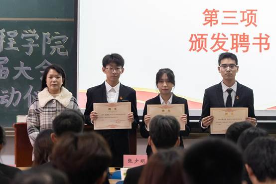 在庄严的国歌声中,本次大会正式拉开帷幕。大会为上一届本科党支部支委和团委学生会学生骨干颁发聘书,并由陈靓老师宣读了新一届学生干部批复及任命文件。到场老师为同学们颁发了荣誉证书及聘书,同学们以热烈的掌声对他们辛勤工作与无私奉献表示感谢。