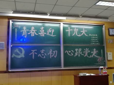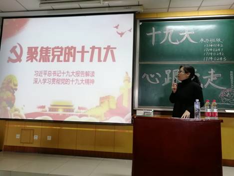 为了深入贯彻落实党的十九大精神, 17140241班于11月2日下午4:00举办“青春喜迎十九大,不忘初心跟党走”主题班会,班会由秦佳文同学主持,邀请张云霞老师带领大家系统深入地学习党的十九大精神。